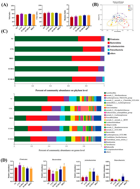 The effects of IU100 on the structure and composition of the gut microbiota. (A) Bacterial richness and diversity estimated by the Sobs, Chao and Shannon indices at the phylum level. (B) Bacterial β-diversity assessed by PCoA based on the unweighted UniFrac distances. (C) Gut microbiota composition at the phylum and genus levels. (D) Comparison of relative abundance of dominant phyla. Data are expressed as the mean ± SEM, n = 7. # p < 0.05 vs. normal control group; * p < 0.05 vs. the CTX-induced model group.