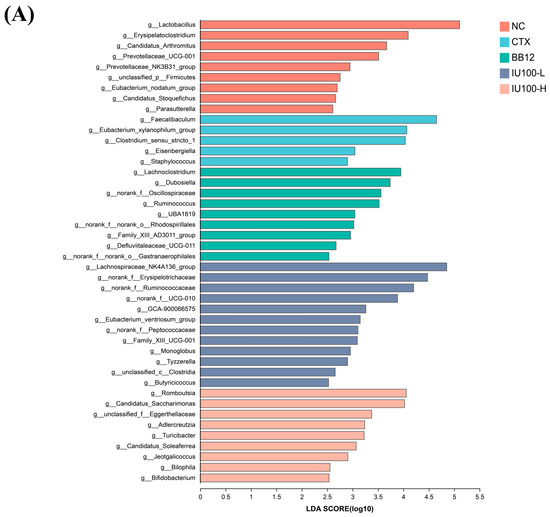 LEfSe analysis was performed, and linear discriminant analysis (LDA > 2.5) was used to evaluate the effect size of taxa with significant differences. In Figure 6A, a total of 44 different taxa at the genus level were identified. This showed that CTX mainly enriched the abundance of Faecalibaculum, the Eubacterium xylanophilum group, Clostridium_sensu_stricto_1, Eisenbergiella and Staphylococcus. Compared with the CTX group, IU100-L increased the abundance of the Lachnospiraceae NK4A136 group, Erysipelotrichaceae, Ruminococcaceae, UCG-010, GCA-900066575, the Eubacterium ventriosum group, Peptococcaceae, Family XIII UCG-001, Monoglobus, Tyzzerella, Clostridia and Butyricicoccus. In the IU100-H group, the abundance of Romboutsia, Candidatus Saccharimonas, Eggerthellaceae, Adlercreutzia, Turicibacter, Candidatus Soleaferrea, Jeotgalicoccus, Bilophila and Bifidobacterium was greatly enhanced.