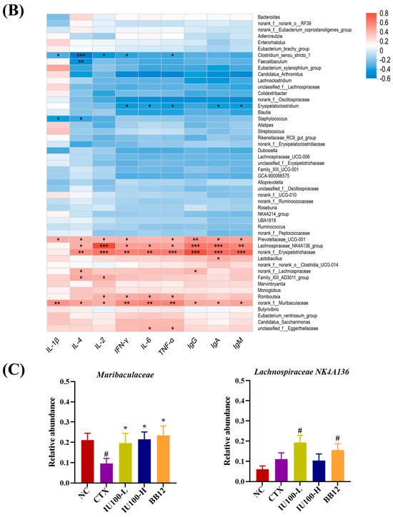 The correlations between the core bacteria and the host immune-related parameters were identified using Pearson correlation analysis. As depicted in Figure 6B, CTX-enriched Clostridium_sensu_stricto_1, Faecalibaculum and Staphylococcus had negative correlations (p < 0.05) with IL-1β, IL-4, IL-2, IFN-γ and TNF-α, while the IU100 treatment increased the key bacteria of the Lachnospiraceae NK4A136 group, Erysipelotrichaceae, Muribaculaceae, Romboutsia and Eggerthellaceae positively correlated (p < 0.05) with IL-1β, IL-2, IFN-γ, TNF-α, IL-4, IL-6, IgG, IgA and IgM. In addition, the top two most abundant genera with significant differences are presented in Figure 6C. After the IU100 intervention, the proportions of beneficial Muribaculaceae and the Lachnospiraceae NK4A136 group were higher (p < 0.05) in immunosuppressed mice. Overall, these results suggested that IU100 effectively influenced the CTX-altered gut microbiota structure and, therefore, played a critical role in immunomodulation.