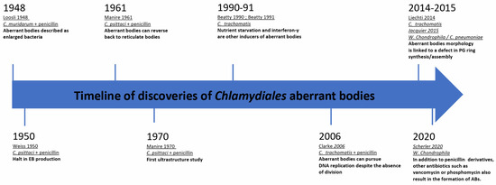 Some of the earliest morphological observations of ABs date back to 1948. In vivo, in mice, Loosli et al. observed aberrant growth of C. muridarum, which at the time was thought to be a virus, upon introduction of penicillin treatments [17]. Two years later, Weiss et al. made a similar observation during infection of chick embryo cells with C. psittaci followed by penicillin treatment. Weiss et al. described the so-called “granules” as greatly enlarged and noted that they could not undergo binary fission after exposure to the antibiotic. Furthermore, it was observed that the RBs on the periphery of the inclusion, which actively divide and closely associate with the inner face of the inclusion membrane, were affected more quickly by the penicillin treatment than those in the center of the inclusion. Ultimately, the bacteria lost their characteristic spherical shape and became irregular “plaques” or ABs [18]. Additionally, Weiss et al. discovered that this persistent state resulted in a halt of EB production. Later investigations of other members of the Chlamydiaceae showed that upon penicillin treatment, a similar division and differentiation defect was detected [19,20]. A timeline of these discoveries is presented in Figure 1.