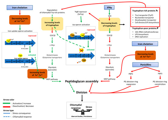 While penicillins affect division by preventing peptidoglycan ring constriction or expansion, persistence inducers such as iron or tryptophan starvation may instead affect peptidoglycan metabolism by blocking the synthesis of necessary peptidoglycan precursors. Interestingly, bactoprenol, one such peptidoglycan precursor, is synthetized by the methylerythritol phosphate pathway (MEP) which is both iron and pyruvate dependent and widely found in bacteria [87]. The MEP pathway initiates with a pyruvate substrate that goes through several reactions to yield bactoprenol, a carrier module known to transport peptidoglycan monomers into existing peptidoglycan chains that are being synthesized. Pyruvate is also a key molecule during the TCA cycle. Therefore, tryptophan depletion may indirectly prevent the MEP pathway from functioning by downregulating c-Myc, ultimately preventing the synthesis of bactoprenol required for peptidoglycan synthesis. In the MEP pathway, the transition from methyl-D-erythritol-2,4-cyclodiphosphate (MEcPP) to isoprenoid precursors isopentenyl pyrophosphate (IPP) and dimethylallyl pyrophosphate (DMAPP) requires two reactions catalyzed by two enzymes, IspG and IspH, respectively. These enzymes contain iron–sulfur clusters which are obtained from free cytosolic iron. During iron starvation, these enzymes are non-functional, potentially halting peptidoglycan synthesis and thus chlamydial division [88].