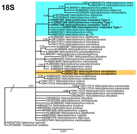 - Anderson, R. A supplemental key to species of Helicotylenchus Steiner, 1945 (Nematoda: Hoplolaimidae) described since 1972 and a description of H. oscephalus n. sp. Can. J. Zool. 1979, 57, 337–342. [Google Scholar] [CrossRef]