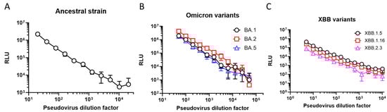 PNT optimization: luciferase endpoint. RLU of 293T/hACE2 cells infected with different amounts of pseudoviruses (as represented by viral dilution factors on the X-axes) expressing either the S protein of SARS-CoV-2 (A) ancestral strain, (B) BA variants, or (C) XBB variants. RLU was measured 2 days (ancestral and Omicron variants) or 3 days (XBB variants) post infection. hACE2, human angiotensin-converting enzyme 2; RLU, relative luminescence units.