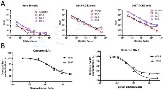 To further identify suitable cells for pseudovirus infection, three different cell lines (Vero-E6, A549/hACE2-TMPRSS2, and 293T/hACE2; same cell numbers/well for each cell line) were compared using the pseudoviruses expressing the ancestral, Omicron BA.1, BA.2, and BA.5 S proteins (Figure 3). In the Vero-E6 cells, the RLU ranged from 206 to 47,813 for different pseudoviruses from the highest (1:2560) to the lowest (1:40) dilution. The luminescence signal plateaued at dilutions beyond 1:2560. By comparison, in the A549/hACE2-TMPRSS2 cells, the luminescence signal ranged from 508 to 687,705 for different pseudoviruses from the highest (1:40,960) to the lowest (1:40) dilution, demonstrating >1 log-higher signals compared to the Vero-E6 cells. In the 293T/hACE2 cells, higher signals were observed for the Omicron BA.2 and BA.5 strains (3.9 × 106 and 5.2 × 106 RLU, respectively), compared to the ancestral and BA.1 strains (8.2 × 105 and 6.9 × 105 RLU, respectively) at the lowest dilution tested. This 1-log difference in the signal was consistently observed for the subsequent dilutions.