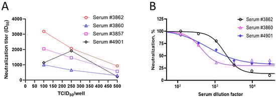 To evaluate the dose dependence of the virus inoculum on the serum neutralization titers, four serum samples were tested using three different amounts (100, 250, and 500 TCID50/well) of pseudovirus expressing the ancestral S protein with the 293T/hACE2 cells. Three out of four samples showed the dose dependence of the pseudovirus-based neutralization titer (PNT ID50). A lower neutralization index (ID50) of the serum samples was observed with increasing amounts of the virus (TCID50/well from 100 to 500) (Figure 4A), suggestive of the dose dependence of the pseudovirus used. These results are in line with the stoichiometry, as higher amounts of the S protein require more antibodies to neutralize the viral infection. However, as the goal of our assay optimization was to establish a sensitive assay without compromising the assay variability, a medium virus titer of 250 TCID50/well was chosen for the next set of experiments. Serum samples were evaluated in the neutralization assay with 250 TCID50/well of the virus. A dose-dependent decrease in the percent neutralization was observed with increasing dilutions of the serum (Figure 4B), suggesting the suitability of 250 TCID50/well of virus inoculum for neutralization experiments.