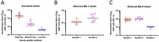 Consistent assay performance is needed for reliable measurement of the neutralization index of the test serum samples. To address the assay quality, the precision was evaluated for the ancestral, Omicron BA.1, and BA.5 variant strains within the same assay run and different assay runs using different titer levels of the serum samples. For the ancestral strain, high-, medium-, and low-titer serum samples were tested (Figure 5A). For Omicron BA.1 and BA.5, respectively, two to three serum samples were tested (Figure 5B,C). These samples showed consistent neutralization titers (ID50) within and between assays, similar to what was observed with the ancestral strain.