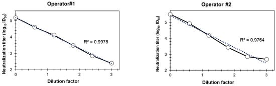 Linearity evaluated the ability of a method to obtain results (e.g., neutralizing titers) that were directly proportional to the amount of analyte (e.g., neutralizing antibodies in a sample). One sample was serially diluted (6 times, 4-fold dilution series) in negative human serum and evaluated in duplicate by two different operators. The observed neutralization titer was compared to the expected neutralizing titer for each dilution.