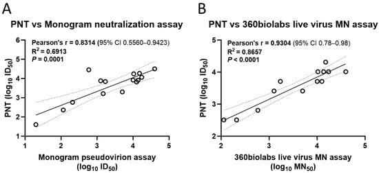 For correlation with a live wild-type virus–based microneutralization (MN) assay, the samples were tested using a validated live virus MN assay (360biolabs, Melbourne, Australia) and using a previously published method [14], followed by comparison of the data with the PNT results using linear regression analysis.
