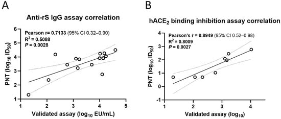 Similarly, the anti-recombinant S (rS) IgG (Pearson’s r = 0.7133, R2 = 0.5088, p = 0.0028; Figure 8A) and hACE2 binding inhibition (Pearson’s r = 0.8949, R2 = 0.8009, p = 0.0027; Figure 8B) titers from the PNT for the ancestral strain significantly correlated with those from the validated assays.