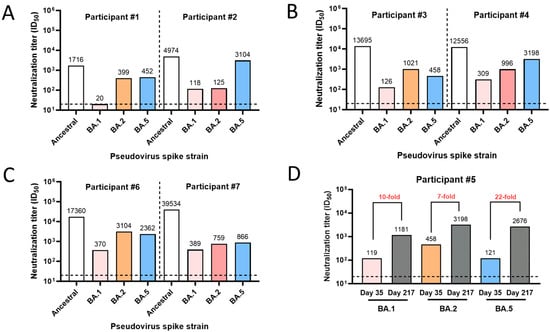 Clinical utility of the PNT. (A–C) Serum samples were used from participants #1 to 4, 6, and 7 from a clinical study where they were vaccinated with NVX-CoV2373. Samples were tested in the PNT against the ancestral or a variant (Omicron BA.1, BA.2, and BA.5) strain. (D) Neutralization titers (ID50) for serum from participant #5, collected on day 35 (14 days after primary series vaccination with NVX-CoV2373) and day 217 (28 days after a booster dose). The horizontal dashed line represents the limit of detection. PNT, pseudovirus neutralization assay.