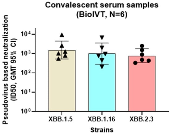 Neutralization activity of convalescent serum samples against Omicron XBB strains. Convalescent serum samples (BioIVT) were evaluated for neutralization activity in the PNT for XBB strains (XBB.1.5, XBB.1.16, and XBB.2.3). Serum samples showing >500 titer ID50 (n = 6) against XBB.1.5 were compared for neutralization activity against XBB.1.16 and XBB.2.3. No significant differences were observed (ordinary one-way ANOVA analysis, multiple comparisons (p > 0.5). GMT, geometric mean titer; PNT, pseudovirus neutralization assay.