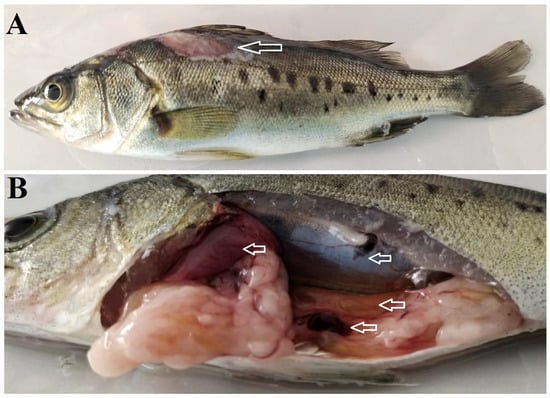 Clinical symptoms of natural coinfection in Lateolabrax maculatus. (A) Obvious clinical symptoms of natural Vibrio harveyi NH-LM1 and Photobacterium damselae NH-LM2 coinfection in L.maculatus (hollow arrow). (B) Visceral lesion features of the diseased fish, arrows indicted the diseased region.