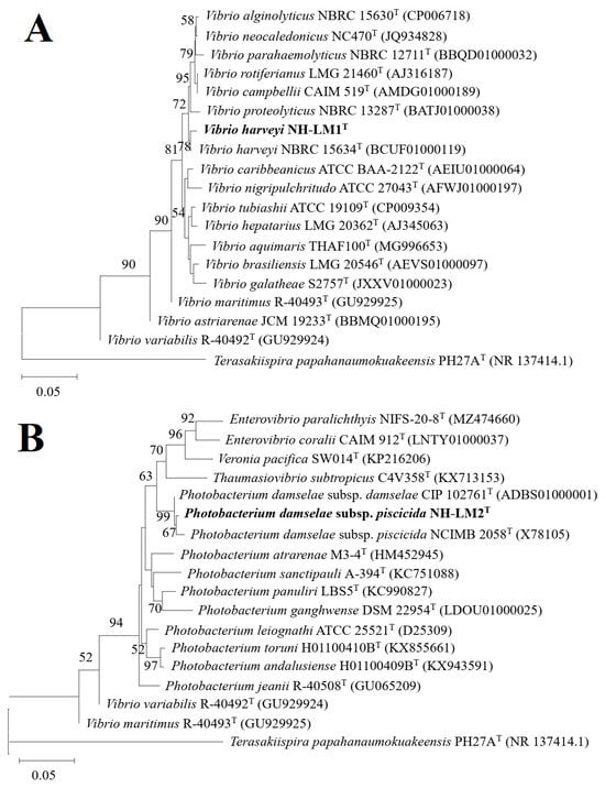 The neighbor-joining phylogenetic tree based on 16S rRNA gene sequences showing the phylogenetic positions of (A) Vibrio harveyi NH-LM1 and (B) Photobacterium damselae subsp. piscicida NH-LM2. Bootstrap values >50% based on 1000 replications are shown at branching points. Terasakiispira papahanaumokuakeensis PH27AT (GenBank accession NR137414.1) was used as an outgroup. Scale bar: 0.05 substitutions per nucleotide position. Bold font indicated the isolated strains of this study.