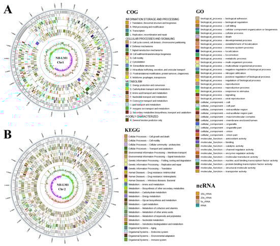 Circular maps of Vibrio harveyi NH-LM1 chromosome 1 and chromosome 2. The base pairs are indicated outside the outer circle (circle 1). Circles 1 to 6 represent the coding genes, COG annotation, KEGG annotation, GO annotation, noncoding RNA (ncRNA), and GC content, respectively. (A) Chromosome 1, (B) Chromosome 2.