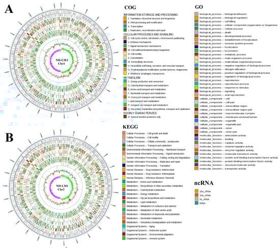 Circular maps of Photobacterium damselae subsp. piscicida NH-LM2 chromosome 1 and chromosome 2. The base pairs are indicated outside the outer circle (circle 1). Circles 1 to 6 represent the coding genes, COG annotation, KEGG annotation, GO annotation, noncoding RNA (ncRNA), and GC content, respectively. (A) Chromosome 1, (B) Chromosome 2.