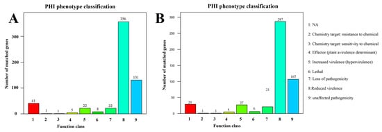 Pathogen host interactions (PHI) annotation of the functional genes of (A) Vibrio harveyi NH-LM1 and (B) Photobacterium damselae subsp. piscicida NH-LM2. Numbers above each column indicate the gene numbers of different pathogen PHI phenotypic mutant types.