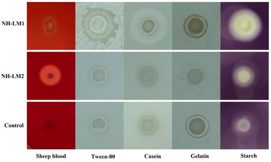 The hemolytic activity, as well as the presence of lytic enzymes such as caseinase, esterase, amylase, and gelatinase in strains NH-LM1 and NH-LM2 were analyzed using 2216E plates supplemented with the corresponding substrates. The results of the extracellular enzymes and hemolytic activity are presented in Figure 6. NH-LM1 exhibited β-hemolysin activity and was capable of producing caseinase, amylase, and esterase, while NH-LM2 demonstrated α-hemolysin activity and produced amylase.