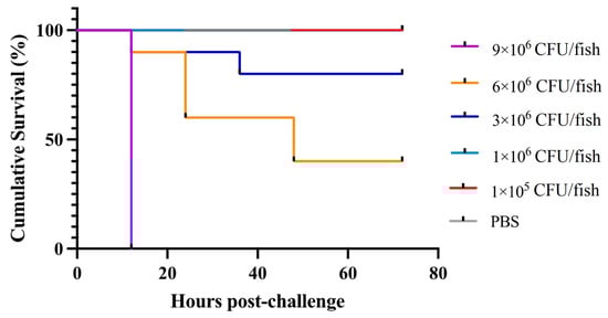 Cumulative survival of Lateolabrax maculatus following Photobacterium damselae subsp. piscicida NH-LM2 infection. L. maculatus were challenged with different concentrations of P. damselae subsp. piscicida NH-LM2 or PBS (control), and the mortalities were observed every 12 h.
