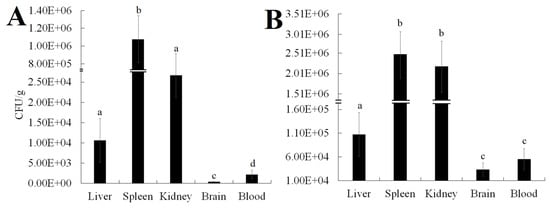 Tissue distributions of Vibrio harveyi NH-LM1 or Photobacterium damselae subsp. piscicida NH-LM2 in infected Lateolabrax maculatus. L. maculatus artificially challenged with NH-LM1 (A) or NH-LM2 (B), and the numbers of recovered bacteria in brain, blood, liver, spleen, and kidney were determined. Data are the means of three independent experiments and are presented as means ± SEM. Different letters on the bars denote the statistical significance (p < 0.05).