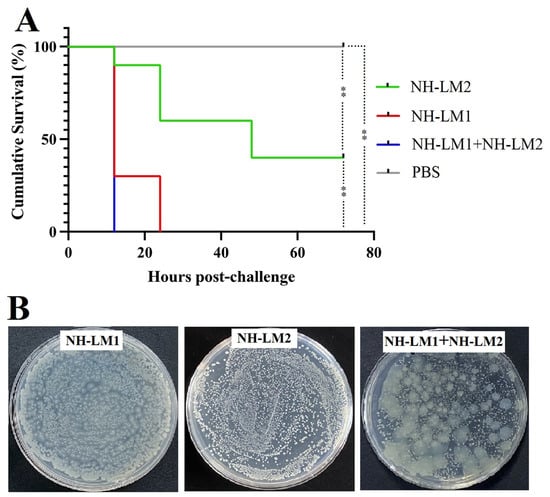 In order to validate the occurrence of artificial coinfection, a challenge experiment was conducted using V. harveyi NH-LM1 and/or P. damselae subsp. piscicida NH-LM2 in L. maculatus. The cumulative mortality rate of fish challenged with P. damselae subsp. piscicida NH-LM2 reached 60% within 48 h, while the cumulative mortality rate of fish challenged with V. harveyi NH-LM1 reached 100% within 24 h. Remarkably, the coinfected fish experienced a cumulative mortality rate of 100% within 12 h (Figure 9A). The mortality rate associated with coinfection was found to be higher compared to that of single P. damselae subsp. piscicida NH-LM2 infection, and the time to death was shorter in cases of coinfection compared to single challenges (Figure 9A). Additionally, both V. harveyi NH-LM1 and P. damselae subsp. piscicida NH-LM2 were successfully re-isolated from the head kidney of deceased L. maculatus, regardless of whether they were administered as a co-challenge or a single challenge (Figure 9B). In summary, the results indicate that coinfection with V. harveyi NH-LM1 and P. damselae subsp. piscicida NH-LM2 leads to an increased pathogenicity in L. maculatus.