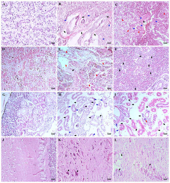 Compared with the control group, the histopathological examination of L. maculatus infected with P. damselae subsp. piscicida NH-LM2 revealed notable alterations: the liver cells lost their complete polygonal structure, display cell swelling, membrane dissolving, and nuclear fragmentation (indicated by blue arrow), in addition, fibroblast proliferation was also observed (Figure 10B, black arrow); lymphocyte infiltration (black arrow) and cellular vacuolar degeneration (evidenced by nuclear fragmentation and dissolution) (Figure 10E, red arrow) occurred in the spleen; severe necrotic foci were observed in the renal tissue (blue arrow), accompanied by vacuolar degeneration of renal tubular epithelial cells (Figure 10H, black arrow); the tigroid body exhibited dissolution in the central region and marginalization in the periphery, while the glial cells displayed loose aggregation (Figure 10K, black arrow). A histopathological examination of L. maculatus infected with V. harveyi NH-LM1 showed that the liver cells showed vacuolar degeneration (blue arrow), karyopyknosis, cytoplasmic lysis (Figure 10C, red arrow), and congestion (Figure 10C, black arrow); the presence of blood clots (black arrow) and occurrence of empty areas were observed (Figure 10F, red arrow) in the spleen; the kidney exhibited vacuolar degeneration of renal tubular epithelial cells (black arrow), thickening of the basement membrane of the renal tubules (red arrow), and fibroblast proliferation (Figure 10I, blue arrow); and the brain displayed pathological characteristics including lymphocyte infiltration and loosely aggregated glial cells (Figure 10L, black arrow).