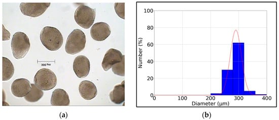 Figure 2 shows photos of the LA microcapsules obtained in the microencapsulation process and the particle size deviation. The obtained mean diameter value of the microcapsules was 300 μm. The values obtained in this research are below the maximum capsule diameter size for oral administration (1 mm), thus achieving adequate palatability. The size of the capsule diameter depends on the microencapsulation technology, its efficacy, as well as the type of materials used and the methodology [26]. The use of sodium alginate and chitosan has been reported to be one of the most protective combinations for Lactobacillus stability because it favors its delivery to the colon at appropriate levels and aids in the maintenance of its survival during gastric and intestinal juice simulation [27].