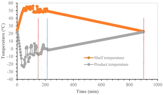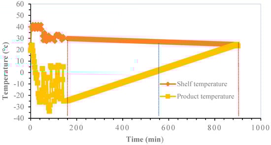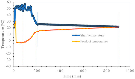 FFD-25 strategy. Primary drying was carried out from 0 to 160 min (red vertical line). Secondary drying (1st stage) was carried out from 160 to 540 min (blue line). Secondary drying (2nd stage) from 540 to 900 min (2nd red line).