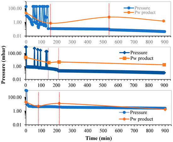 Pressure variation in the FFD experiments performed: FFD-25 (top), FFD-15 (medium), and FFD-3 (bottom). The orange line shows the vapor pressure profile of the product, Pw, through the intermediate critical points of drying indicated with vertical lines.