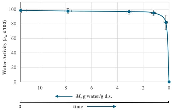 Residual moisture at the end of drying or water activity is a decisive parameter in the quality of the final dehydrated product that can influence the final viability of the LA during storage. To this end, a study was carried out to analyze the change in water activity (aw) with the moisture content M of the product. Water activity measurements were made at different times during the drying process. Triplicate samples were taken on the initial sample at three moments of the primary drying step and towards the end of the first part of the secondary drying step. The results can be seen in Figure 7, which shows the mean value and the observed deviation of aw and M in the measurements taken, indicating the water activity of the product, aw, as a function of a decreasing M value or, in other words, with an increasing drying time. It can be seen that the results correspond to primary drying, in which aw decreases smoothly with the aqueous content with a significant decrease in M of about 90% of the initial water content. In secondary drying, the drop in aw is more intense, distinguishing a first phase (“knee” in Figure 7) of moderate decrease, followed by a strong decrease until the final drying step.