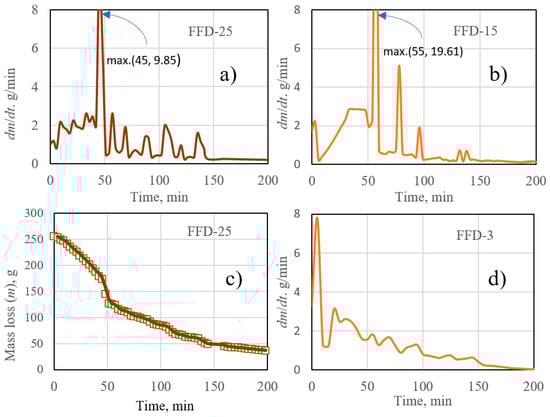 Drying rate profiles obtained in the simulation of FFD experiments: (a) FFD-25 case, (b) FFD-15 case, (d) FFD-3 case, and (c) mass loss of FFD-25.