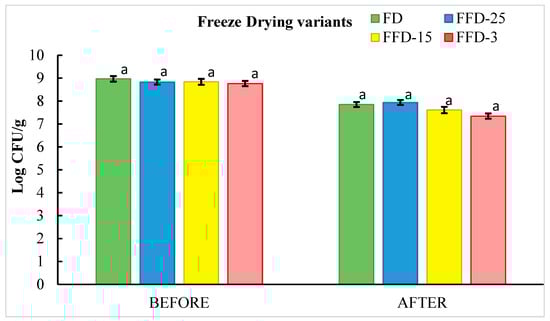 According to these results, all freeze-drying variants showed a decrease in cell viability after application. Although the cell viability presented by FD and FFD-25 are comparable (Log CFU/g 7.85 ± 0.01 and 7.94 ± 0.01) (no significant differences, p < 0.05), it is noteworthy that the freezing temperature of −25 °C reported the highest cell viability of 89.92%, which is 2.74% higher than that obtained in the freeze-drying process, which was 87.52%.