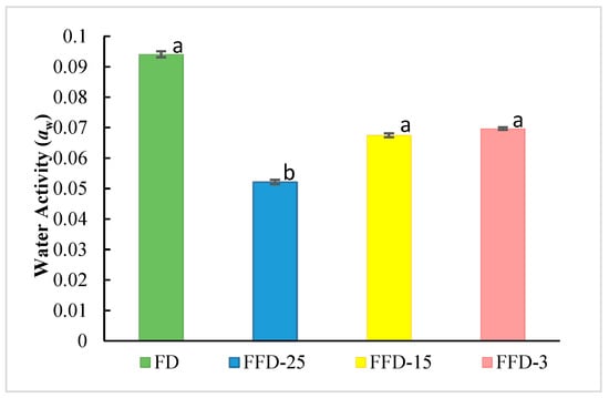 FFD-25 presented the lowest value of water activity (aw) of 0.0522 ± 0.002 (significant differences, p < 0.05), which is 55% lower than the value presented in the product treated with the FD control, which was 0.0941 ± 0.003, showing that the freezing temperature of −25 °C was the most effective in removing the bound water contained in the microencapsulated LA. Also, FFD-15 and FFD-3 presented lower aw values than the FD control (no significant difference, p > 0.05).