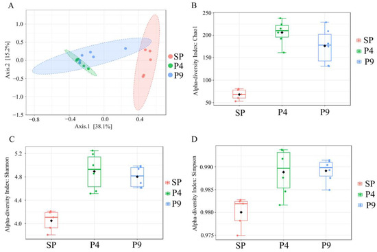 (A) PCoA plot showing beta-diversity analyses. (B) Chao1, (C) Simpson, and (D) Shannon diversity indexes for the three sample groups analyzed. SP = Samples without POME (Palm Oil Mill Effluent); P4 = soil samples after 4 days of POME application; P9 = soil samples after 9 days of POME application.