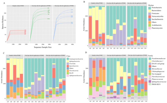 Our sequencing effort was sufficient to describe bacterial diversity (Figure 2A) once rarefaction curves reached a plateau. It was possible to observe that P9 samples showed higher species richness (Figure 2A). In total, 41 phyla, 197 families, and 3287 genera were described in the dataset. ASVs without taxonomic affiliations were defined as unclassified microorganisms and represented 2.3% of the dataset. The most abundant phyla were Proteobacteria, Bacteroidetes, Firmicutes, and Verrucomicrobia (Figure 2B). Bacteroidetes and Verrucomicrobia were abundant in samples without POME application, while Proteobacteria and Firmicutes were abundant in the P4 and P9 samples (Figure 2B). Thus, a shift in bacterial composition was observed after POME application. Regarding bacterial classes, Gammaproteobacteria, Sphingobacteriia, Clostridia, Spartobacteria, Flavobacteriia, Bacilli, and Alphaproteobacteria were the most abundant. Gammaproteobacteria prevailed in the P4 and P9 samples, while Sphingobacteriia was abundant in the SP samples (Figure 2C). At the family level, Pseudomonadaceae, Clostridiaceae 1, DA 101 soil group, Chitinophagaceae, and Moraxellaceae were the most abundant (Figure 2D), with Pseudomonadales, Clostridiaceae, and Moraxellaceae being most prevalent in soil fertilized with POME, while Chitinophagaceae and DA 101 soil group were the most abundant in samples without POME application.