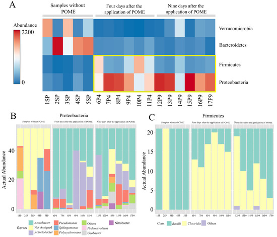 (A) Heatmap comparing the relative abundance of the Proteobacteria, Firmicutes, Bacteroidetes, and Verrucomicrobia phyla. The yellow square highlights the phyla with greater abundance in the area where POME was applied. Species richness assigned at the level of (B) genus or (C) class for the Proteobacteria and Firmicutes phyla, respectively.