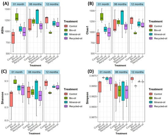 The number of ASVs obtained from different periods ranged from 540 to 1512 ASVs. Only the number of ASVs in the bio-oil treatment of 1-month samples had a significant difference (p < 0.05) compared to the control, while there was no significant difference between treatments and controls in other periods (Figure 1A). Similarly to observed ASVs, there was a significant difference (p < 0.05) in the average Chao1 richness between the bio-oil treatment and control of 1-month samples; in contrast, other comparisons in each period showed no significant difference (Figure 1B). From Figure 1C,D, it can be seen that chainsaw lubricant amendment affected Shannon and Simpson indices of bacterial communities in the soil samples. All three treatments had a higher level of bacterial diversity than controls at one month, with the highest level belonging to the bio-oil treatment; however, these differences in both Shannon and Simpson indices were insignificant among the treatments (Figure 1C,D). At six months, Shannon and Simpson indices in control were higher than those of the bio-oil and recycled oil treatments, and the mineral oil treatment had the highest indices. However, all treatments had no significant difference (Figure 1C,D). Bacterial diversity had a significant difference between the treatments at twelve months. Specifically, the Shannon and Simpson indices in control were the highest. At the same time, the lowest levels were indicated in the bio-oil treatment, and there was a significant difference (p < 0.05) between the control and bio-oil treatment (Figure 1C,D). The Simpson index in the mineral oil treatment also had a significant difference (p < 0.05) compared to the control, while the recycled oil treatment showed no significant difference compared to the control (Figure 1C,D). In general, bacterial diversity was affected by chainsaw lubricant amendments. Bio-oil and mineral oil had significant changes, while recycled oil had insignificant variations in the species richness and diversity index of the soil bacterial community.