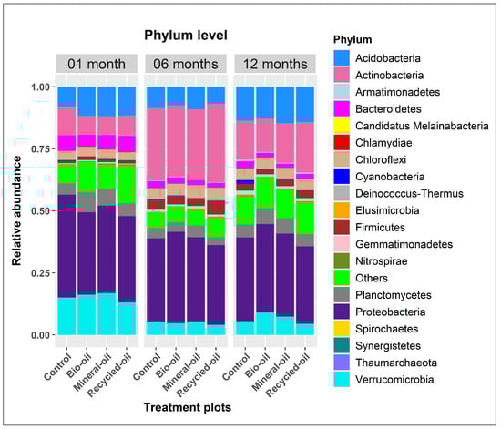 A total of 19 bacterial phyla were detected from all soil samples, of which the number of bacterial phyla obtained from bio-oil samples was also 19 phyla, followed by the control sample with 18 phyla. In comparison, mineral oil and recycled oil samples both had 17 phyla (Figure 2). The similarity of soil bacterial community composition between the controls and treatments was mainly Proteobacteria, Actinobacteria, Verrucomicrobia, Acidobacteria, Planctomycetes, Bacteroidetes, Chloroflexi, and Firmicutes; however, their relative abundances were different (Figure 2). The most dominant phyla were Proteobacteria, with relative abundances of 33.24–41.48%, 32.09–36.89%, and 31.17–35.60% at the one-month, six-month, and twelve-month samples, respectively. Actinobacteria accounted for the second dominant phyla in the six-month and twelve-month samples, with relative abundances of 28.67–31.64% and 13.48–20.36%, respectively, while this one-month sample belonged to Verrucomicrobia, with relative abundances of 13.12–16.80%. Elusimicrobia was only found in bio-oil samples, while Synergistetes occurred in both control and bio-oil samples with a very low relative abundance (Figure 2).