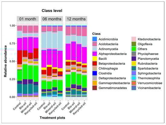 Changes in soil bacterial compositions were also shown at the class level. The number of bacterial classes with an average relative abundance of more than 1.0% was 13, 17, and 18 in the soil samples of one-month, six-month, and twelve-month periods, respectively (Figure 3). The relative abundance of bacterial classes was different among the treatments and periods. For example, Actinomycetia had the highest abundance in the six-month samples compared to other periods. In comparisons of one-month samples, Actinomycetia had the highest relative abundance (10.01%) in the control compared to bio-oil, mineral oil, and recycled oil. However, these bacteria were most dominant in the recycled oil treatments at six-month and twelve-month periods, with a relative abundance of 27.69% and 15.17%, respectively (Figure 3).