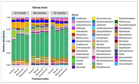 A total of 46 bacterial genera with an average relative abundance of more than 1.0% were detected in all soil samples (Figure 4). The number of genera ranged from 12 to 17 in one month samples, then tended to increase in the six month samples (24–27) and decrease in the 12 month samples (19–21). Bio-oil treatment had the highest number of genera, while recycled oil treatment had the lowest number of genera at one month. Massilia was the most common genus detected in control at one month, with an average relative abundance of 14.99%, while Chthoniobacter was the most abundant genus detected in bio-oil, mineral oil, and recycled oil, with an average relative abundance of 13.39%, 14.32%, and 10.47%, respectively. At six months, Pseudarthrobacter (5.57%) was the most abundant genus in control, while Bradyrhizobium was the most abundant genus detected in bio-oil, mineral oil, and recycled oil, with an average relative abundance of 5.29%, 5.90%, and 5.44%, respectively. For the twelve month period, Paludibaculum (4.44%) had the highest abundance in the control, Chthoniobacter was the most abundant genus in bio-oil and mineral oil with an average relative abundance of 7.38% and 5.74%, respectively, while Acidobacterium (4.22%) accounted for the highest relative abundance in the recycled oil treatment (Figure 4).