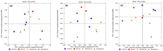 Principal Coordinate Analysis (PCoA) was conducted using the weighted UniFrac distances to visualize similarities in the soil bacterial community composition of different treatments at three sample collection periods. At one month, the contribution proportion of two axes, PC1 and PC2, accounted for 65.98% of the total variance of 12 variables, of which the rates of the PC1 and PC2 axes were 50.20% and 15.78%, respectively (Figure 5A). The division into groups did not differ much between the control and the treatments, and chainsaw lubricants had less effect on the soil bacterial community composition. At six months, the contribution rates of the PC1 and PC2 axes were 57.77% and 10.50%, respectively, accounting for 68.27% of the total variance of 12 variables (Figure 5B). Bio-oil and recycled oil treatments were divided into different groups with control, and these two treatments affected soil bacterial community composition. At twelve months, the contribution proportion of two axes, PC1 and PC2, accounted for 66.39% of the total variance of 12 variables, of which the rates of the PC1 and PC2 axes were 49.83% and 16.56%, respectively (Figure 5C). Control was divided into a separate group with treatments, and all three treatments affected soil bacterial community composition. These results showed that different chainsaw lubricants and their time of application affected the soil bacterial community composition.