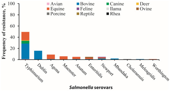 Furthermore, bovine-recovered serovars displayed the highest overall frequency of antimicrobial resistance at 51.5%, primarily driven by resistance in S. Typhimurium (27.7%) and S. Dublin (15.8%). Equine isolates showed a resistance rate of 37.6%, where S. Typhimurium (14.9%), S. Agona (7.9%), and S. Muenster (5.9%) were the predominant contributors (Figure 2; Tables S2 and S3). Conversely, serovars from other animal host species showed lower resistance rates (≤5%) (Figure 2).