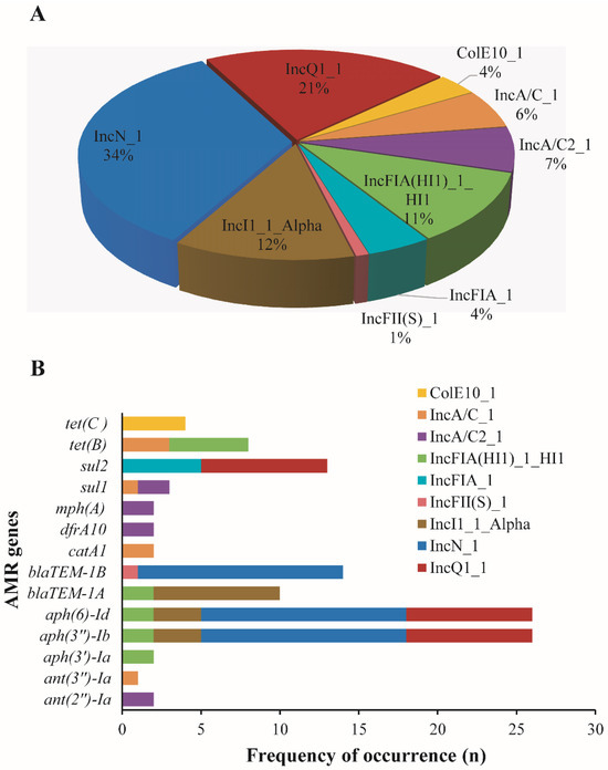 Plasmids harboring antimicrobial resistance genes in Salmonella isolates. (A): Pie chart highlighting the frequency occurrence of different plasmids (n = 9) associated with antimicrobial resistance (AMR) genes in Salmonella isolates investigated in this study. (B): Bar chart showing the distribution of different AMR genes (n = 14) on the detected plasmids in different Salmonella isolates. Note: These genes were co-located on similar contigs harboring the plasmids.