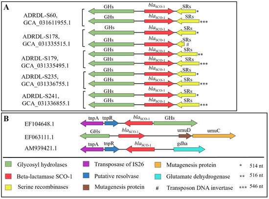 First of all, the blaSCO-1 gene in all these five isolates was not associated with any plasmid. The BLASTP analysis with the gene sequence blaSCO-1 showed a 100% identity with proteins found in isolates with the accession numbers EF104648.1, EF063111.1, and AM939421.1. Furthermore, we comparatively investigated the genetic environment of our isolates and other blaSCO-1 positive isolates (Figure 6A). Upstream of all copies of the blaSCO-1 gene in our isolates was occupied by a gene encoding the cellulase family glycosyl hydrolase, comprising 399 amino acids (aa), situated 161 base pairs away from the gene in opposite orientation, while the serine recombinase family protein gene of varying nucleotide lengths (108–546 nucleotides) was located 29 base pairs away from the blaSCO-1 gene, also in the opposite orientation. Notably, the shortest copy of this gene encoded a specific transposon DNA-invertase of 35 amino acids and was found in the ADRDL-S178 isolate (Figure 6A). Comparison with the identified isolates from NCBI showed some similarities upstream and variations downstream of the blaSCO-1 gene (Figure 6B).