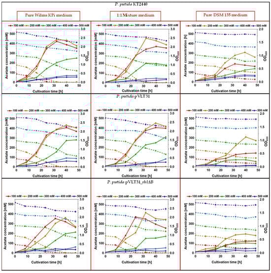 Growth (continuous lines) and acetate consumption (dashed lines) of the wild-type strain P. putida KT2440 (first row of the figures), the empty vector strain P. putida [pVLT31] (second row of the figures), and the mono-rhamnolipid producing strain P. putida [pVLT31_rhlAB] (third row of the figures). For each strain, cultivation was carried out in modified Wilms KPi medium (first column of the figures) in a 1:1 mixture of modified Wilms KPi medium and modified DSM 135 medium (second column of the figures) and in pure modified DSM 135 medium (third column of the figures). For each combination, cultivation was carried out separately with 100, 200, 300, 400, and 500 mM acetate as the carbon source. The error bars represent the deviations of the biological triplicates.