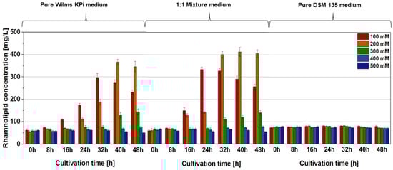 Production of mono-rhamnolipids by P. putida [pVLT31_rhlAB] supplemented with 100 mM (red), 200 mM (brown), 300 mM (green), 400 mM (blue), or 500 mM (purple) acetate as the carbon source, respectively. Cultivation was carried out in modified Wilms KPi medium in a 1:1 mixture of modified Wilms KPi medium and modified DSM 135 medium and in pure modified DSM 135 medium. The error bars represent the standard deviation of the biological triplicates.