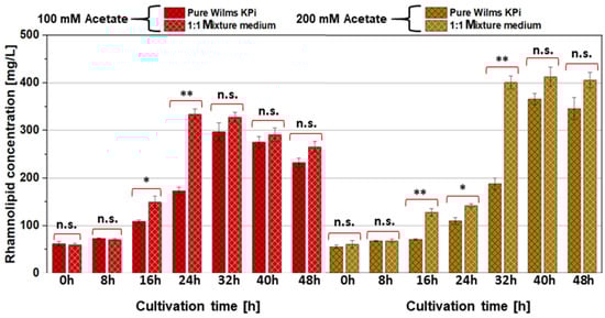 Comparison of the mono-rhamnolipid production of P. putida [pVLT31_rhlAB] supplemented with 100 mM (red) and 200 mM (brown) acetate as the carbon source cultivated in pure modified Wilms KPi medium (black grid columns) and in a 1:1 mixture medium of modified Wilms KPi medium and modified DSM 135 medium (white grid columns). The statistical significance of the differences of the rhamnolipid concentrations reached with pure Wilms KPi medium and 1:1 mixture medium is illustrated. The error bars represent the deviations of the biological triplicates. *: p-value > 0.05; ** p-value > 0.01: n.s.: not significant.