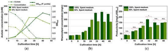 Growth (continuous lines) and acetate consumption (dashed lines), (a) mono-rhamnolipid-production (b) and productivity values with the statistical analyses of the productivity differences (c) of P. putida [pVLT31_rhlAB] grown in different shares of cell-free A. woodii [pMTL83251] spent medium. Cultivation was either carried out in pure cell-free spent medium (dark green) obtained from the Awo2 culture (Figure S1) or in a 1:1 mixture of spent medium obtained from the Awo1 culture (Figure S1) and fresh modified Wilms KPi medium (light green) without additional acetate. The error bars represent the standard deviations of the technical triplicates, *: p-value > 0.05; n.s.: not significant.