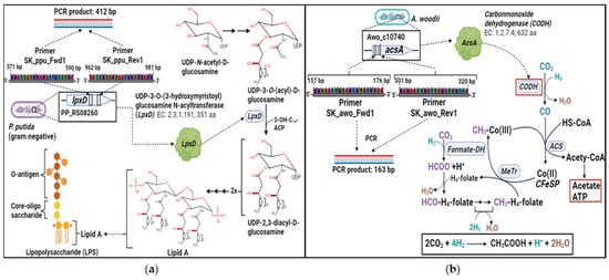Illustration of species-exclusive target genes selected for qPCR. For the detection of the gram-negative bacterium P. putida, the gene lpxD (PP_RS08260) was chosen as the target. The gene encodes UDP-3-O-(3-hydroxymyristoyl) glucosamine N-acyltransferase, which plays an important role in the biosynthesis of lipid A, a central component of lipopolysaccharides (LPSs) commonly found forming the outermost layer of a gram-negative cell wall. (a) The target gene chosen for the detection of A. woodii was acsA (Awo_c10740), which encodes the carbon monoxide dehydrogenase (CODH) subunit of the bifunctional CODH/acetyl-CoA synthase (ACS) enzyme complex. This subunit is responsible for the introduction of one of the two CO2 molecules into the Wood-Ljungdahl pathway (b).