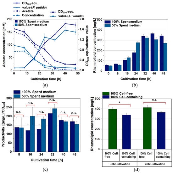 Growth of P. putida [pVLT31_rhlAB], decay of A. woodii [pMTL83251], and acetate consumption (dashed lines) (a) as well as mono-rhamnolipid concentrations (b) and productivity values in concentration per OD600, with the statistical significance of the productivity differences (c) in the different shares of cell-containing spent medium of A. woodii [pMTL83251]. The OD600 equivalence (equ.) values were calculated from the data of qPCR for the genes exclusive to the respective bacterial species that were compared to the ones obtained from a standard curve. Cultivation was either carried out in pure cell-containing spent medium (dark blue) obtained from the Awo4 culture (Figure S1) or in a 1:1 mixture of spent medium obtained from the Awo3 culture (Figure S1) and fresh modified Wilms KPi medium (blue) without additional acetate. Further illustrated is a comparison of the overall highest reached concentrations of mono-rhamnolipids, obtained in pure cell-free and cell-containing A. woodii spent medium, with the statistical significance of the concentration differences. (d) The error bars represent the standard deviations of the technical triplicates, *: p-value > 0.05; n.s.: not significant.