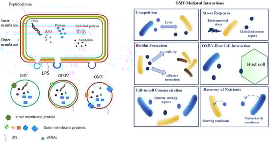 Bacterial vesicle (EV) production and mediated functions. (left) Production of EVs: EVs are produced through outer membrane blebbing, wherein portions of the outer membrane (OMV), outer–inner membrane (OIMV) bud off, or inner membrane (IMV) result in the formation of vesicles containing a cargo of proteins, RNA, and metabolites, or even DNA for OIMVs and IMVs, as reported by Toyofuku et al. [16]. (right) EV-mediated functions: EVs play diverse roles facilitated by their unique cargo, including competition, stress response, biofilm formation, host interaction, cell–cell communication, and nutrient recovery.